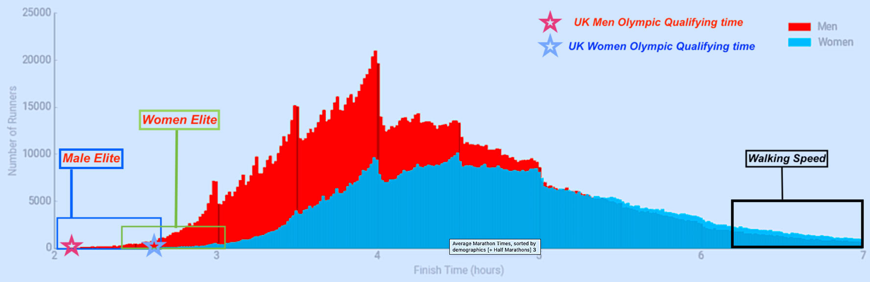 What this chart shows is that the proportion of people completing a Marathon under three and half hours is tiny, not at all average, the stars show the UK Athletics Olympic Marathon qualification requirements. These people are at the extreme end of elite, there are probably more people with an IQ of 200 than there are Olympic qualifiers. Statistically speaking these people are absolute outliers and are statistically completely irrelevant to the rest of us. Almost every one of this super minority will have been spotted at a very young age as an outstanding talent and will have been nurtured over many years.